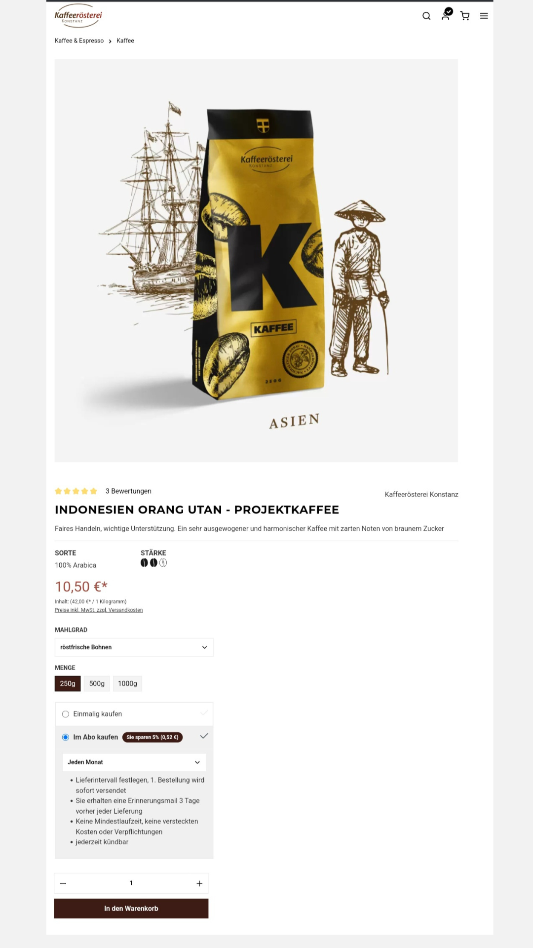 Wählen Sie zunächst Ihren Kaffee für das Abo aus. Auf der Produktseite des ausgewählten Kaffees wählen Sie außerdem Ihren gewünschten Mahlgrad, die Menge sowie die Anzahl aus, die Sie als Abo bestellt haben möchten. Klicken Sie nun auf die Auswahl ''Im Abo kaufen''.