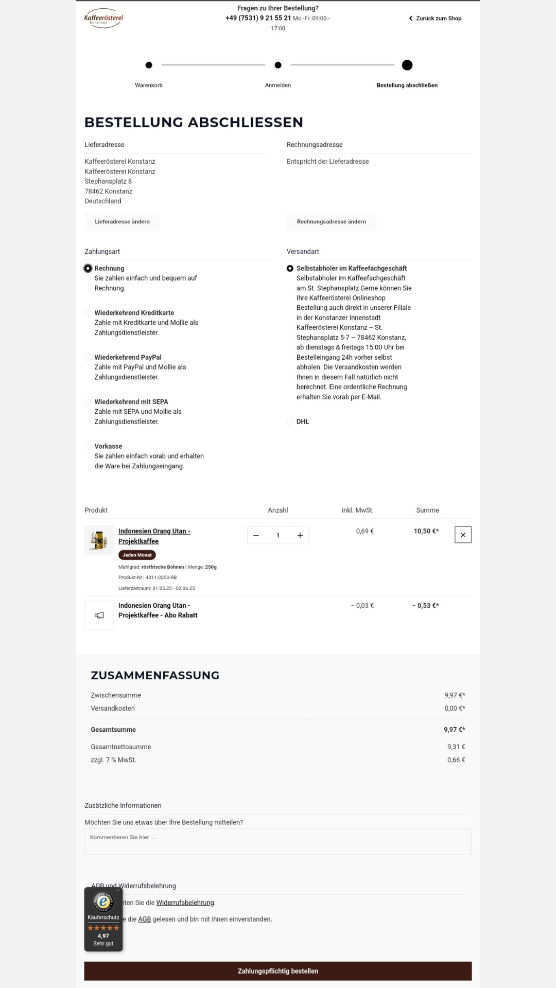 3. Bezahlung und Rechnung des Kaffee Abos